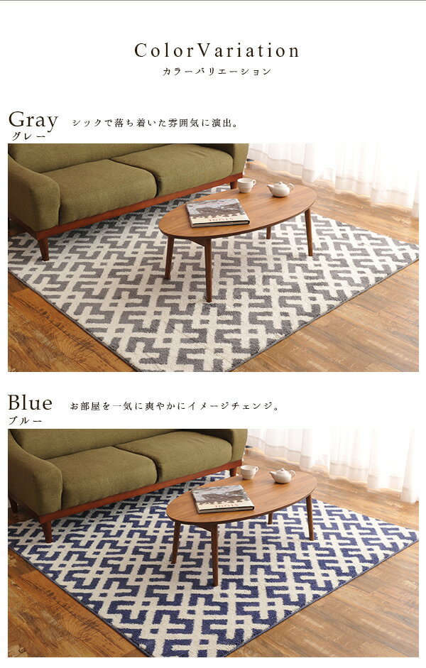 幾何学柄で特徴的なデザインの「クロシー」は一枚敷くだけでイメージをお部屋のイメージをガラッと変えます。